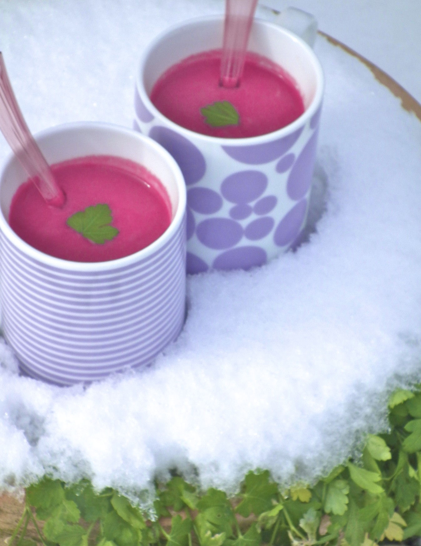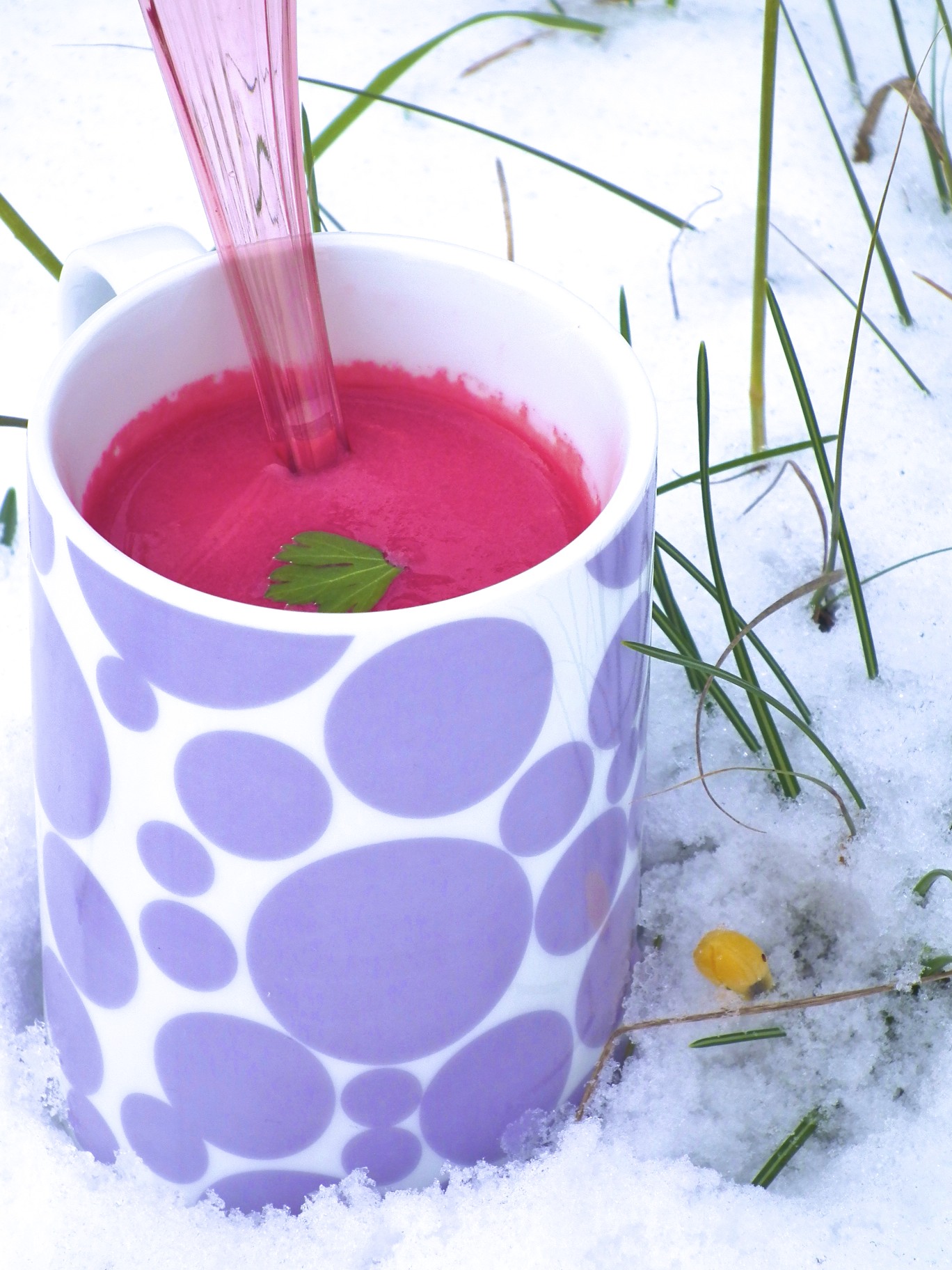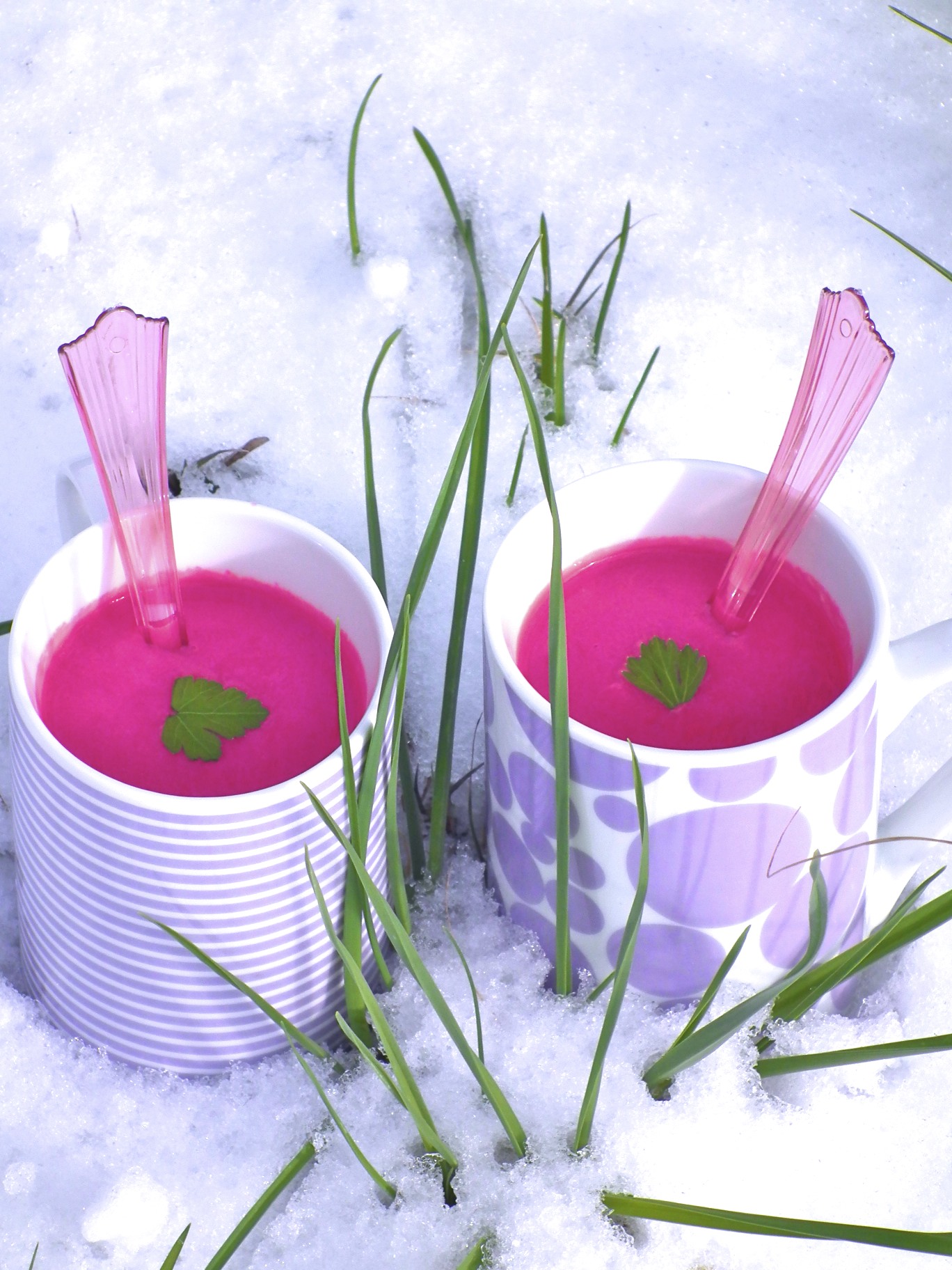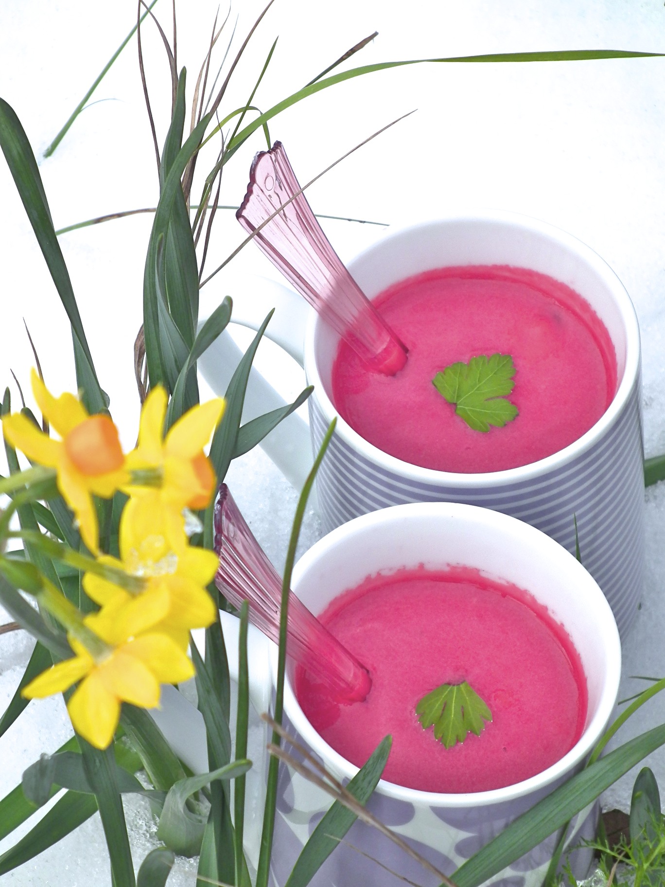 Epluchez et hachez l’oignon. Pelez les panais et les pommes de terre, coupez-les en cubes. Faites revenir l’oignon avec le beurre dans un faitout, ajoutez les pommes de terre et les panais, laissez chauffez pendant 2 minutes, mélangez bien. Ajoutez l’eau ou le bouillon, portez à ébulition et laissez cuire pendant 20 minutes. Ajoutez les betteraves et laissez cuire pendant encore deux ou trois minutes. Salez et poivrez puis incorporez la crème et les jus du gingembre*, mélangez.
