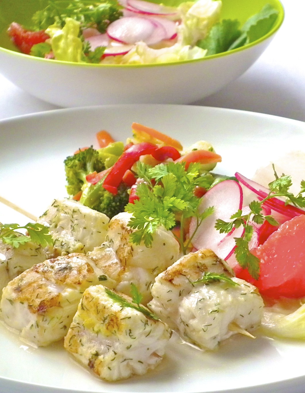 Brochettes de lingue aux agrumes, légumes sautés et salade acidulée