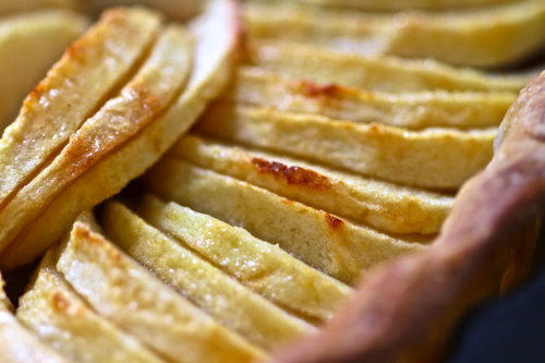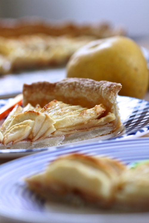 Maman (la maman de JL), a sorti un grand plat du four… et ce délicieux parfum qui m’intrigue… là, devant moi, ces alignements de tranches de pommes si régulières… si parfaites… si jolies…  « Vous êtes arrivés à temps pour le goûter, le thé est prêt ! » (traduit par JL) dit-elle avec un grand sourire.