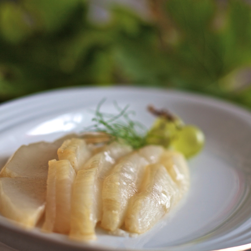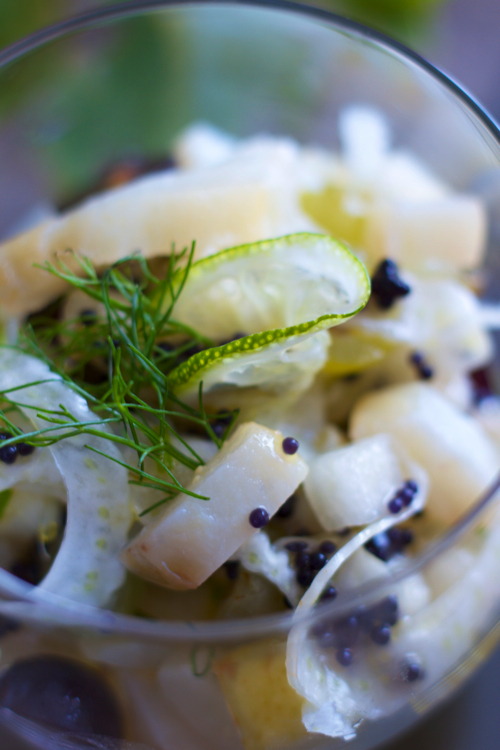 Coupez le filet de flétan en petits cubes, lavez la poire et coupez-la en petit cubes, lavez le fenouil et coupez-le en fines rondelles (n’hésitez pas à utiliser une mandoline pour avoir des tranches très fines), lavez et coupez les raisins en deux.