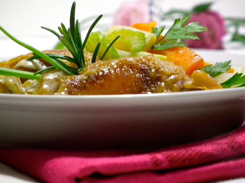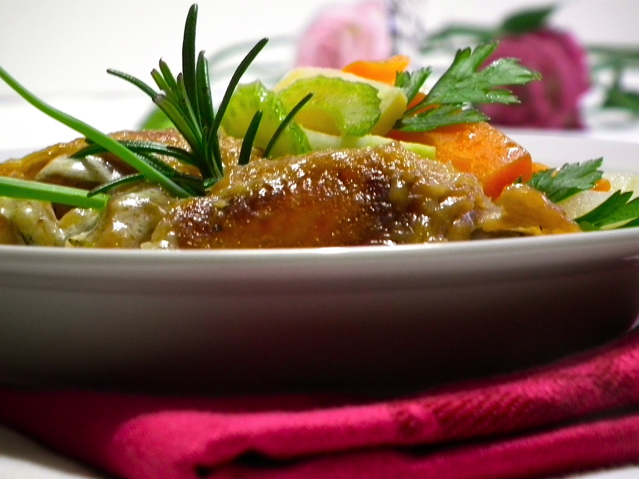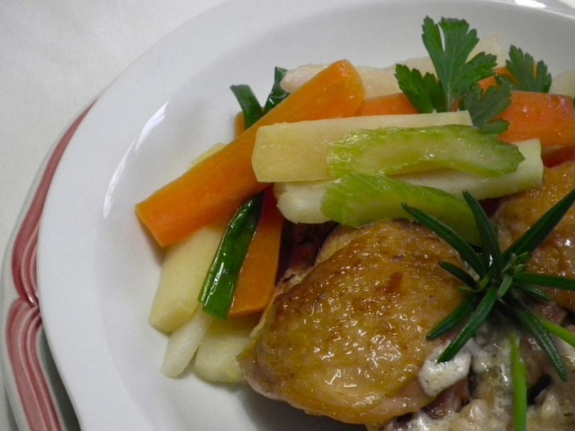 Retirez et disposez le poulet dans un plat. Chauffez le jus de cuisson et incorporez la crème, mélangez et rectifiez l’assaisonnement. Nappez le poulet avec la sauce et servez-le accompagné de légumes sautés.