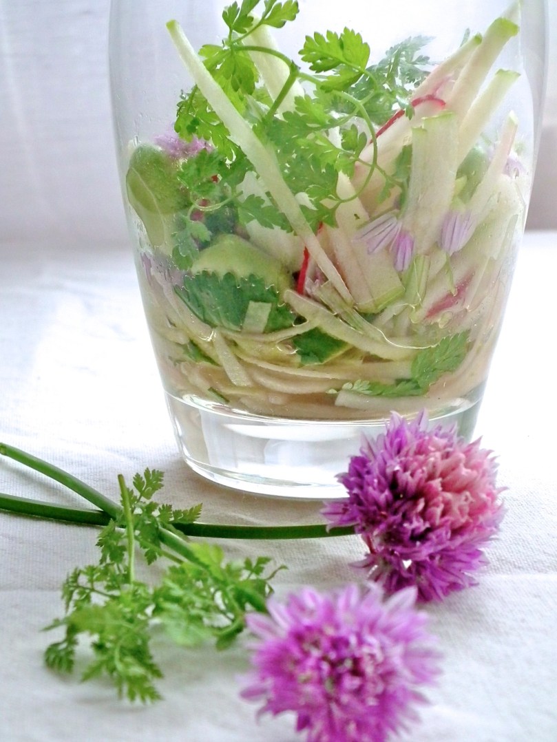Chaque année, quand le soleil revient, c’est le moment de préparer la traditionnelle salade de pomme de terre qui accompagne les grillades. La recette m’a été transmise par une tante Allemande qui a su marquer mon premier été en Europe par sa gentillesse, sa cuisine raffinée et sa connaissance des plantes.
